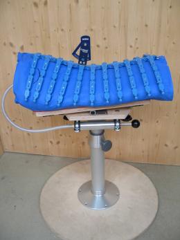 Der Sattelbock besteht aus drei Teilen, einem stabilen Sockel, einer höhenverstellbaren Säule und der eigentlichen Rückenauflage mit Kippmechanismus und Vakuumpumpe. Alles in allem wiegt er 18,6 Kilogramm. Die Füllung des Sattelbocks besteht aus einem Kunststoffgranulat, das sich optimal in Form bringen lässt und somit ein exaktes Nachmodellieren des Pferderückens gewährleistet.